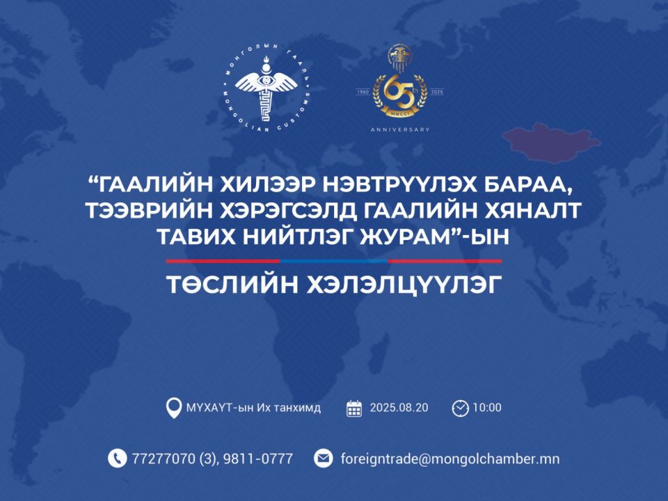 September 30, 2025Гаалийн байгууллагын 2025 оны “Хэрэглэгчийн үнэлгээ”-ний судалгааг хийж гүйцэтгэх албан байгууллага, хамт олон та бүхнийг УРЬЖ БАЙНА Монгол Улсын Засгийн Газрын 2025 оны 43 дугаар тогтоолын […]