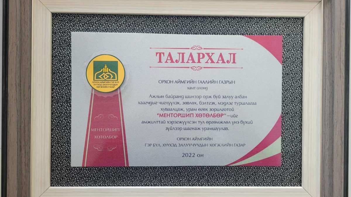 Залуучуудын хөгжлийг дэмжих тухай хуулийн 6 дугаар зүйлийн 6.1.2, 6.1.5, “Залуусын оролцоо-Хөдөлмөр эрхлэлт” сарын аяны хүрээнд ажлын байранд шинээр орж байгаа албан хаагчдыг чиглүүлэх, зөвлөх, бэлтгэх, мэдлэг туршлагаа хуваалцах, идэвх санаачилгыг нэмэгдүүлэх зорилготой “Менторшип хөтөлбөр”-ийг амжилттай хэрэгжүүлсэн Орхон аймгийн Засаг даргын дэргэдэх Гэр бүл, хүүхэд, залуучуудын хөгжлийн газраас Орхон аймаг дахь гаалийн газрын хамт олныг шалгаруулж, “Талархал” ирүүлсэн байна.