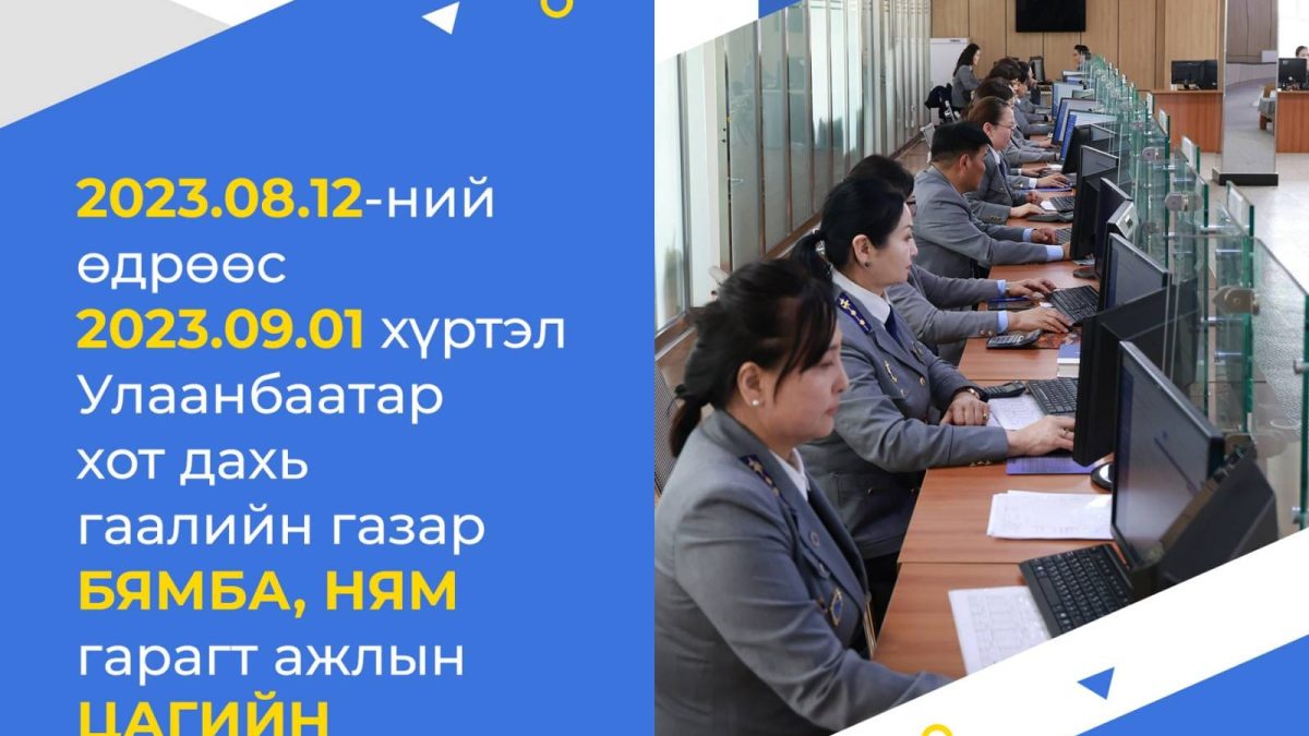 Монгол Улсын хэмжээнд үүсээд буй цаг агаарын хүндрэлтэй нөхцөл байдал, түүнээс үүсэх аливаа эрсдэлийг бууруулахад шаардагдах тоног төхөөрөмж, дагалдах хэрэгслийн гаалийн бүрдүүлэлтийг шуурхай хийх, өвөлжилтийн бэлтгэл хангах цаг үеийн хойшлуулшгүй ажил, гадаад худалдаанд дэмжлэг үзүүлэх зорилгоор УЛААНБААТАР ХОТ ДАХЬ ГААЛИЙН ГАЗАР 2023 оны 8-р сарын 12-ны өдрөөс 2023 оны 9-р сарын 01-ны өдөр хүртэл БЯМБА, НЯМ гарагт АМРАХГҮЙ, ажлын цагийн хуваарийн дагуу АЖИЛЛАНА