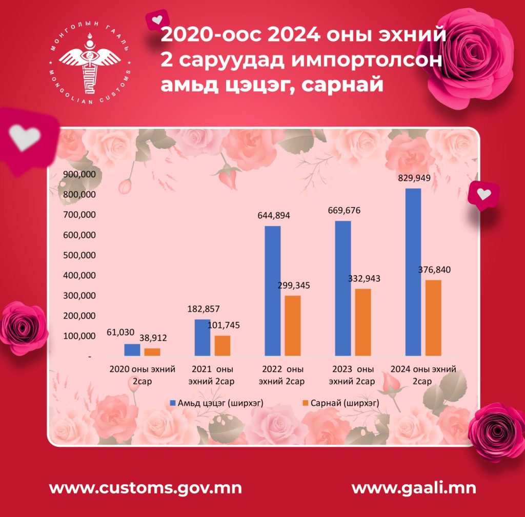 Харин өнгөрсөн оны мөн үед нийт 443.5 мян.ам.долларын 669,676 ширхэг амьд цэцэг импортолсноос 219.0 мян ам.долларын 332,943 ширхэг амьд сарнай импортолжээ.