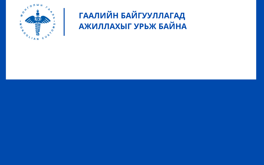 Гаалийн ерөнхий газрын Аж ахуй, үйлчилгээний албанд “МЕХАНИКЧ”, “ТУСЛАХ ТОГООЧ”, “УГААГЧ” ажилд авна.