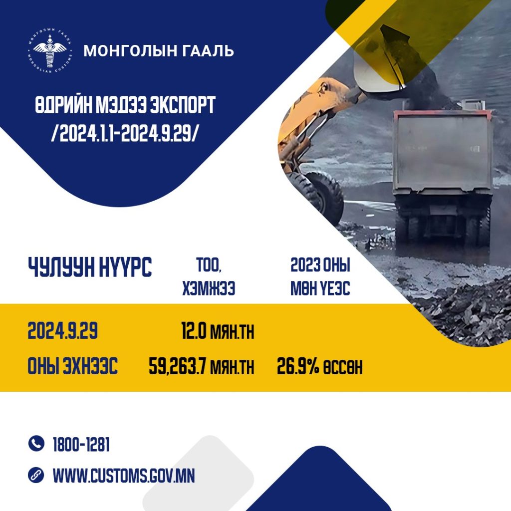 2024.09.29-ны өдөр 12.0 мянган тонн, 2024 оны эхнээс 59,263.7 мянган тонн экспортолсон.