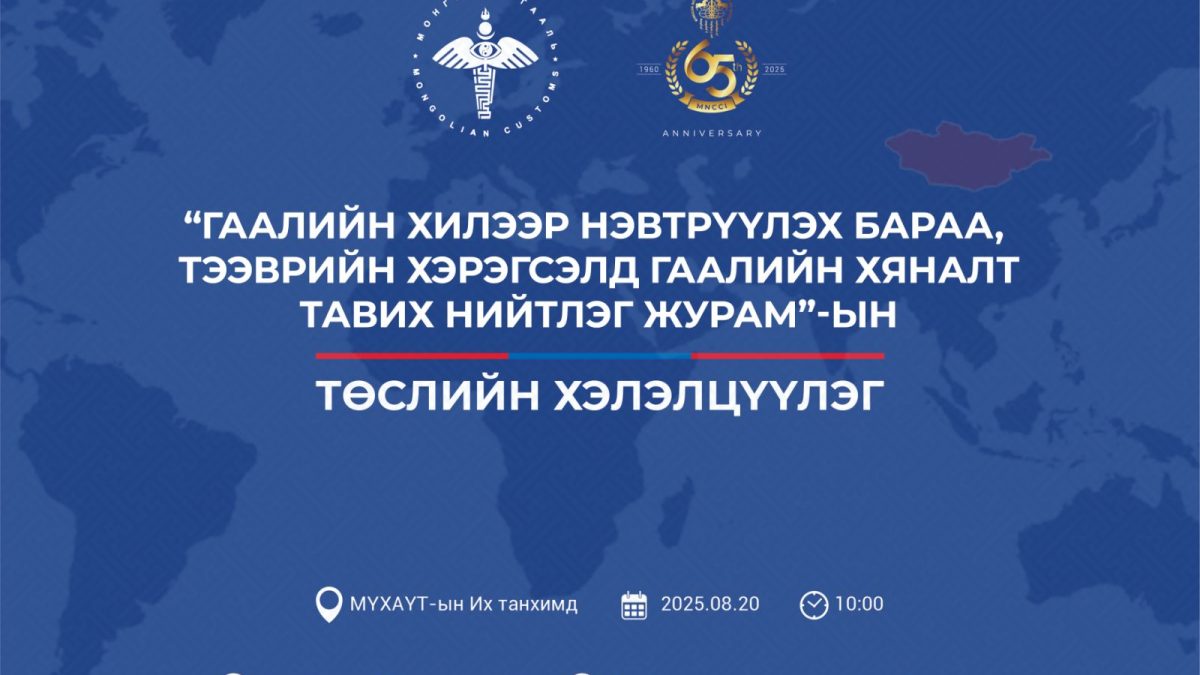 Гаалийн ерөнхий газраас МҮХАҮТ-тай хамтран “Гаалийн хилээр нэвтрүүлэх бараа, тээврийн хэрэгсэлд гаалийн хяналт тавих нийтлэг журам”-ын төслийн нээлттэй хэлэлцүүлгийг 2025 оны 8 дугаар сарын 20-ны өдрийн 10:00 цагт МҮХАҮТ-ын Их танхимд зохион байгуулах гэж байна.