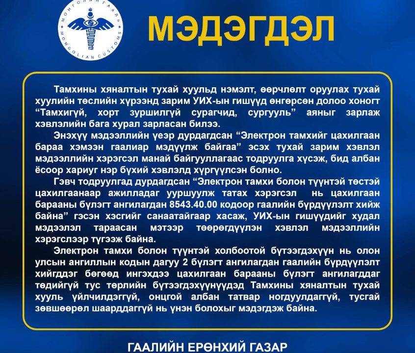 Санал хүлээн авах хугацаа: 2025 оны 10 дугаар сарын 01-ний өдрөөс 2025 оны 10 дугаар сарын 08-ны өдрийг дуустал. Oyunchimeg.tso@customs.gov.mn цахим хаягаар хүлээн авна.