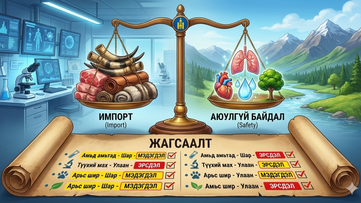 Хүнс хөдөө, аж ахуйн, хөнгөн үйлдвэрийн сайдын 2025 оны 11 дүгээр сарын 20-ны өдрийн А/571 дүгээр тушаалаар “Хүний эрүүл мэнд, байгаль орчинд үзүүлэх эрсдэлийн түвшинг харгалзан импортын мэдэгдэл олгох амьтан, тэдгээрийн гаралтай түүхий эд бүтээгдэхүүний жагсаалт шинэчлэгдэн батлагдлаа.