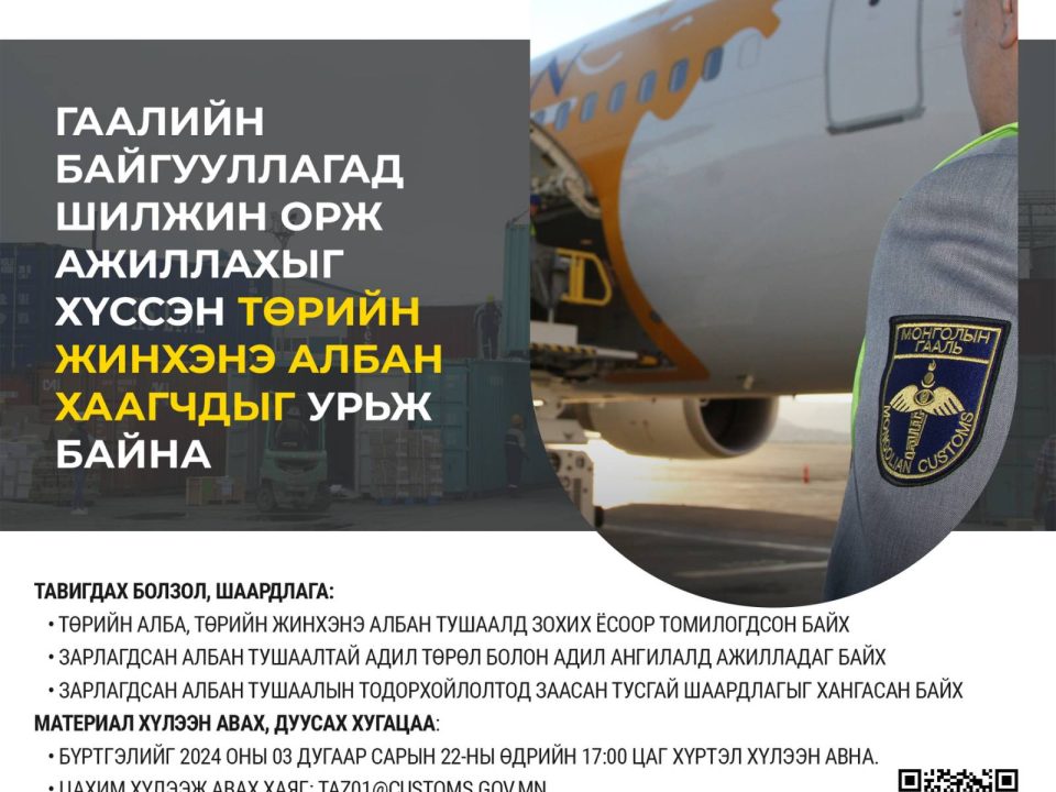 Гаалийн ерөнхийн газрын Хорио цээрийн хэлтсээс 2024 оны 03 дугаар сарын 12-ны өдөр гаалийн харьяа газар, хороодын хорио цээрийн хяналт хариуцсан гаалийн улсын /ахлах/ байцаагч, албаны