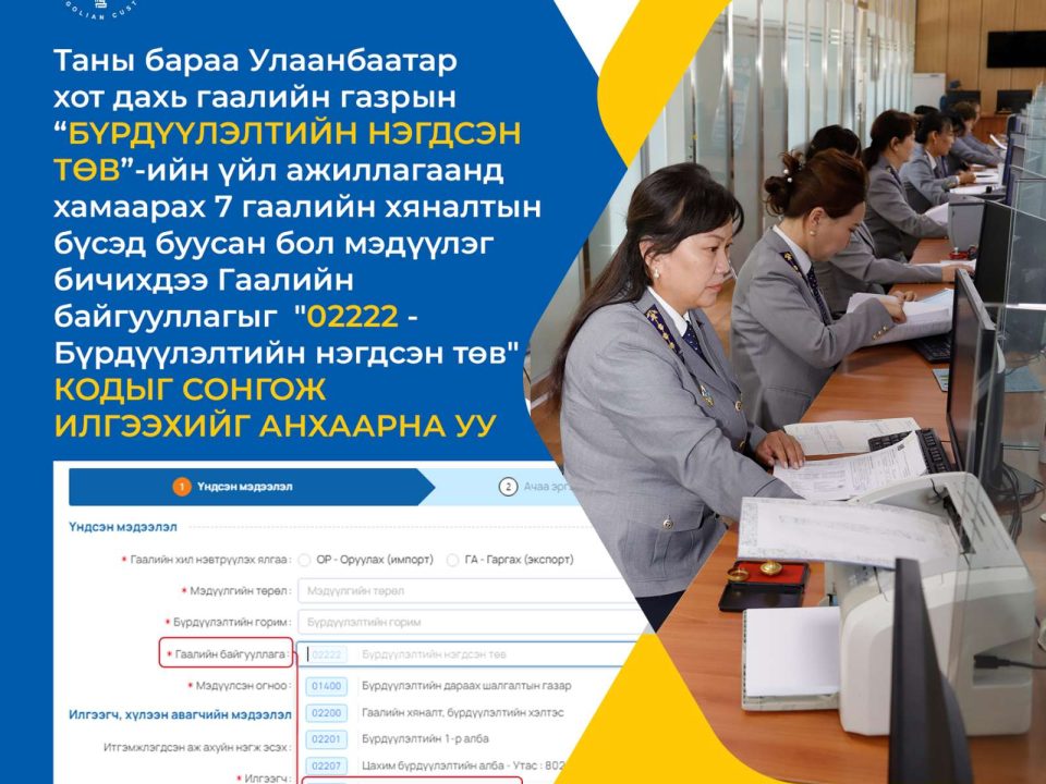 “БҮРДҮҮЛЭЛТИЙН НЭГДСЭН ТӨВ”-ӨӨС АНХААРУУЛЖ БАЙНА “Цахим бүрдүүлэлтийн нэгдсэн төв”-ийн үйл ажиллагааг ирэх 05 дугаар сарын 01-ний өдрөөс эхлэн Улаанбаатар хот дахь Гаалийн газар туршилтаар нэвтрүүлж байна. Иймд