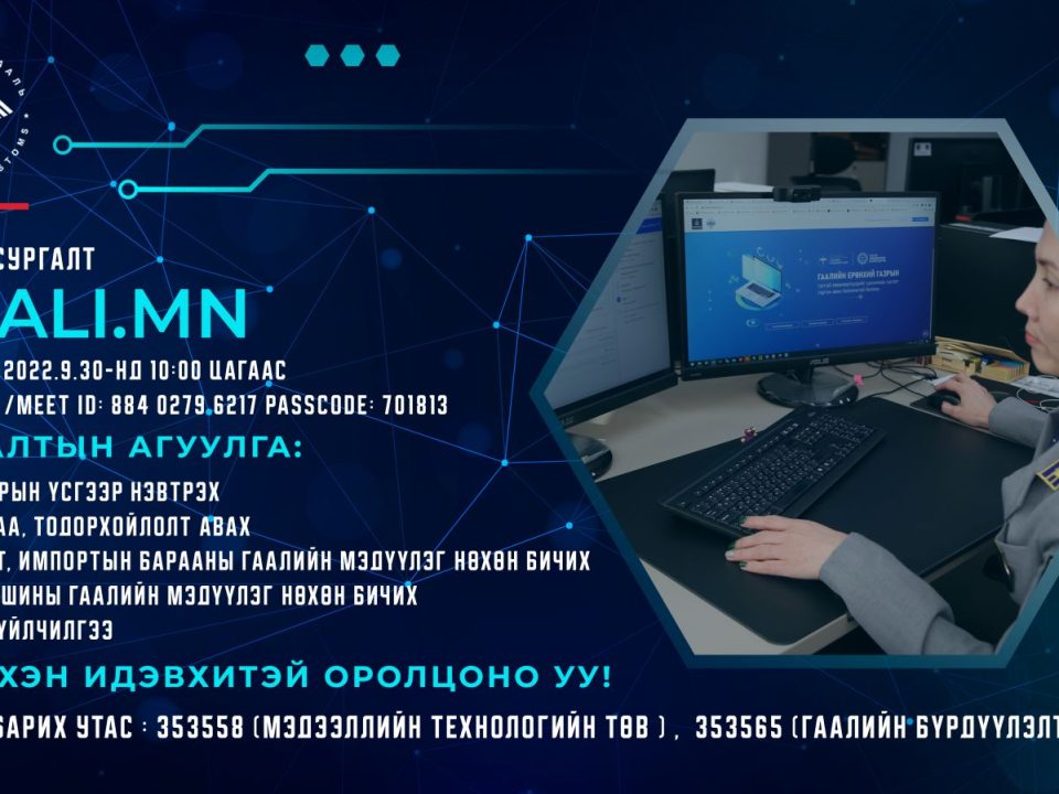 ГААЛИЙН ЕРӨНХИЙ ГАЗРААС ГААЛИЙН ЦАХИМ ҮЙЛЧИЛГЭЭНИЙ WWW.GAALI.MN СИСТЕМИЙН СУРГАЛТЫГ ОНЛАЙНААР ЗОХИОН БАЙГУУЛНА. Гаалийн ерөнхий газраас гаалийн цахим үйлчилгээний www.gaali.mn системийн сургалтыг дараах агуулгаар онлайнаар зохион байгуулна.