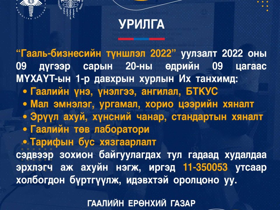 УРИЛГА “Гааль-бизнесийн түншлэл 2022” уулзалт 2022 оны 9 дүгээр сарын 20-ны өдрийн 09 цагаас МҮХАҮТ-ын I давхрын хурлын Их танхимд Гаалийн үнэ, үнэлгээ, ангилал, БТКУС; Мал