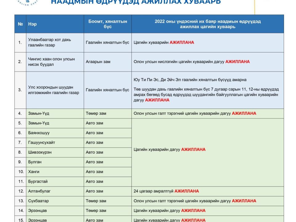 2022 ОНЫ ҮНДЭСНИЙ ИХ БАЯР НААДМЫН ӨДРҮҮДЭД УЛААНБААТАР ХОТ ДАХЬ ГААЛИЙН ГАЗРЫН ХЯНАЛТЫН БҮСҮҮД ХЭВИЙН ГОРИМООР АЖИЛЛАНА. МӨН ЗАМЫН-ҮҮД, ГАШУУНСУХАЙТ, ШИВЭЭХҮРЭН, БАЯНХОШУУ, БУЛГАН, ХАНГИ, БУРГАСТАЙ БОЛОН