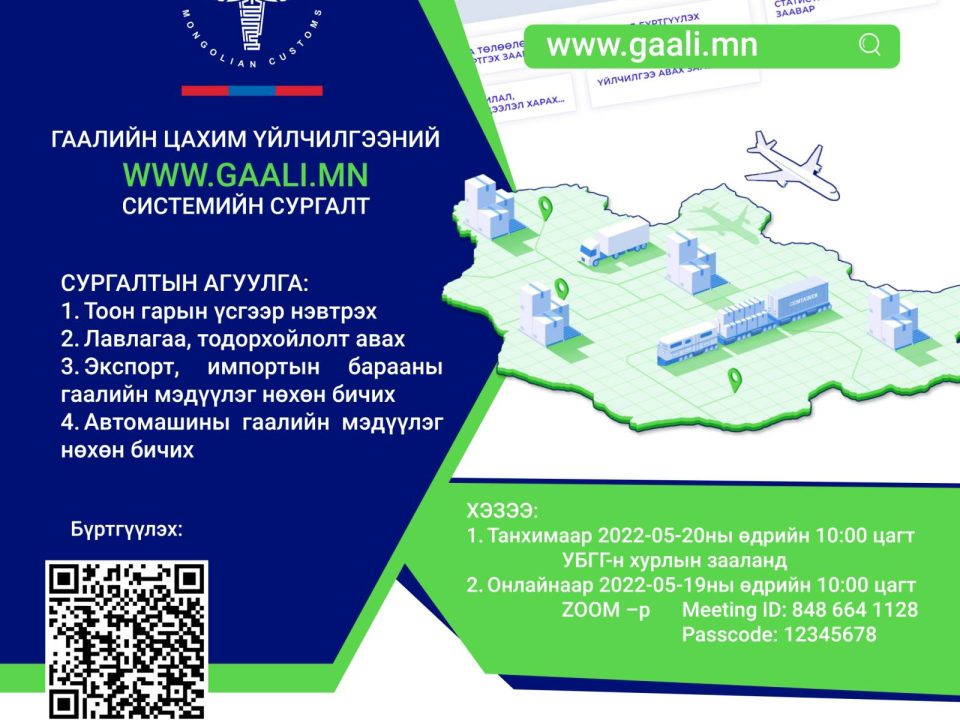 ГААЛИЙН ЦАХИМ ҮЙЛЧИЛГЭЭНИЙ WWW.GAALI.MN СИСТЕМИЙН СУРГАЛТ Нийтэлсэн огноо: 2022/05/17 09:20 Гаалийн ерөнхий газраас гаалийн цахим үйлчилгээний www.gaali.mn системийн сургалтыг дараах агуулгын дагуу онлайнаар болон танхимаар явуулна.